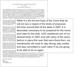 The USO itself mimics the MEA in a lot of ways. The MEA can be a harsh critic of school districts that don't give in to its demands. Similarly, the USO takes its own potshots at the MEA. In anticipation of the next round of contract negotiations, the chairman of the USO Bargaining Committee reports that: "While it is the fervent hope of the Union that we will not see a repeat of the kinds of proposals this time around that hit the table in 2007, it is absolutely necessary to be prepared for the worst, and hope for the best."