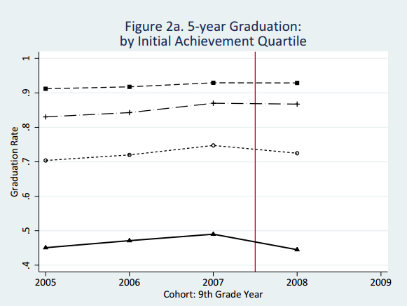 Indeed, researchers estimate that the five-year graduation rate for students in the bottom quartile declined by 5 percentage points after MMC requirements were imposed.