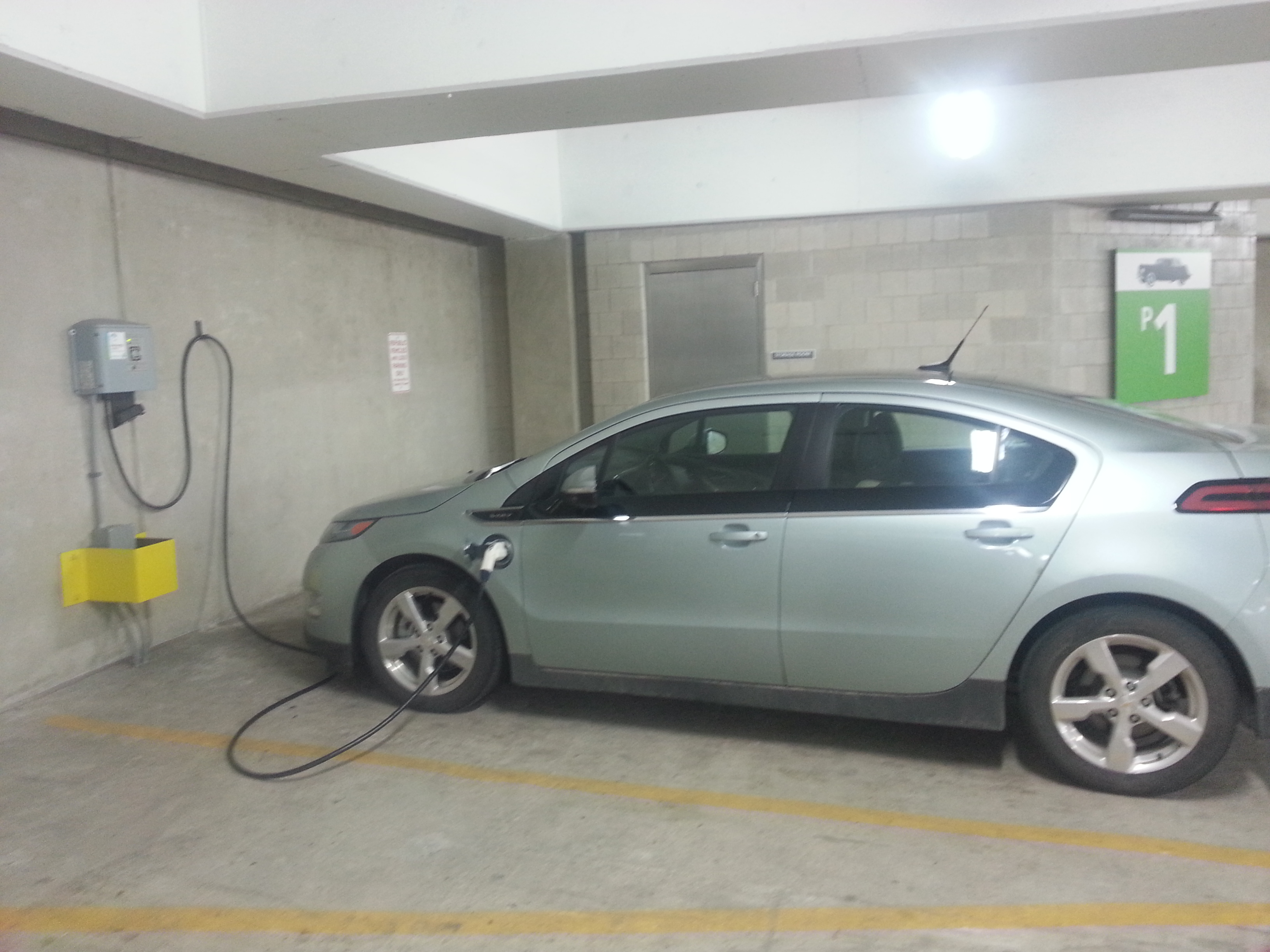 Pictured nearby is a Chevy Volt, a vehicle already infamous for costing taxpayers up to $3 billion in production and sales incentives, being charged at a downtown Ann Arbor parking garage. The owner really did get a free ride, because the photo was taken on a Sunday, when city parking fees are waived.