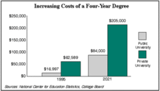 According to the College Board, a child born today probably will face college costs ranging from $84,000 for four years at a public university to more than $205,000 for a degree from a private institution.