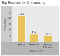 When asked why they had privatized these services, school districts gave any one of eight general reasons (respondents were allowed to select any number of categories that applied to them). Forty-five percent of school officials listed financial savings as one of their first reasons; 14 percent cited personnel reasons; 10 percent said efficiency of service; 6 percent, contractor expertise; 3 percent, equipment; 1 percent, being forced into outsourcing. In addition, 15 percent said they did not know the reason for outsourcing at their schools; some districts had been outsourcing for so long that current staff were not present when the original decision to privatize was made. Survey respondents frequently listed more than one reason.