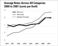 Rather than lump Michigan with states that blundered in implementing their restructuring, a direct assessment is available for measuring the impact of electricity restructuring on rates in Michigan. In 2000, the year restructuring was adopted, Michigan rates were the highest in the region and higher than the national average. By 2003, Michigan rates were below the national average, demonstrating the fallacy of composition that restructuring always results in larger rate increases. Meanwhile, rates in Wisconsin were well below the Michigan rates and the national average in 2000. Wisconsin briefly experimented with choice, but restored monopoly power to big utilities, and now the gap between Michigan and Wisconsin rates has completely closed.