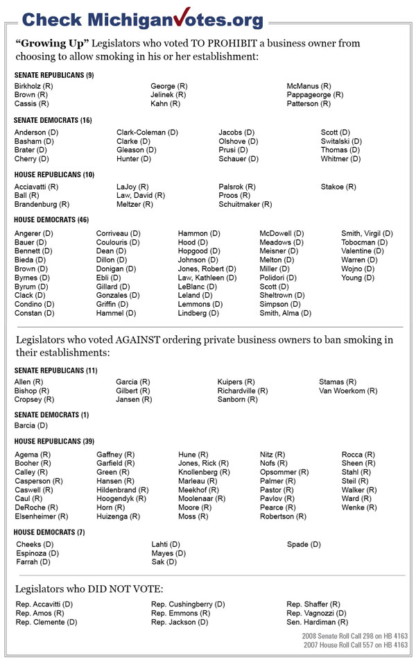 Postscript: House Bill 4163 of 2007, now pending before the Michigan Legislature, would prohibit a business owner, including the owner of a bar or restaurant, from choosing to allow smoking in his or her establishment. The state Senate and House of Representatives have approved this bill in slightly different forms, but have a dispute regarding whether to apply the bill to certain casinos and this has prevented it from being presented to the governor.
