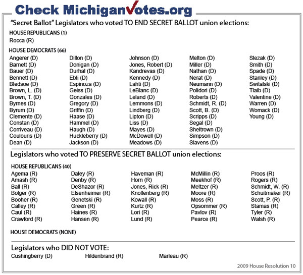 By contrast, the state Senate had already passed its own resolution opposed to EFCA in February, noting that secret ballot elections are "at the heart of our Michigan democratic tradition," and further protesting EFCA's binding arbitration process that "would remove any incentive for the employer or the union to adopt realistic bargaining positions." SR 16 passed on a straight party-line basis, with one Democrat and one Republican not voting.