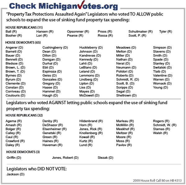 Calculating the potential impact of the sinking fund expansion that the House approved in December 2008, the Michigan Chamber warned that it could lead to property tax hikes of $3.2 billion to $7.6 billion. While the version of HB 4313 passed by the House is restricted to spending on buses and computers, and was thus slightly more limited than the 2008 version, the business group's opposition to expanded taxing power remained high.