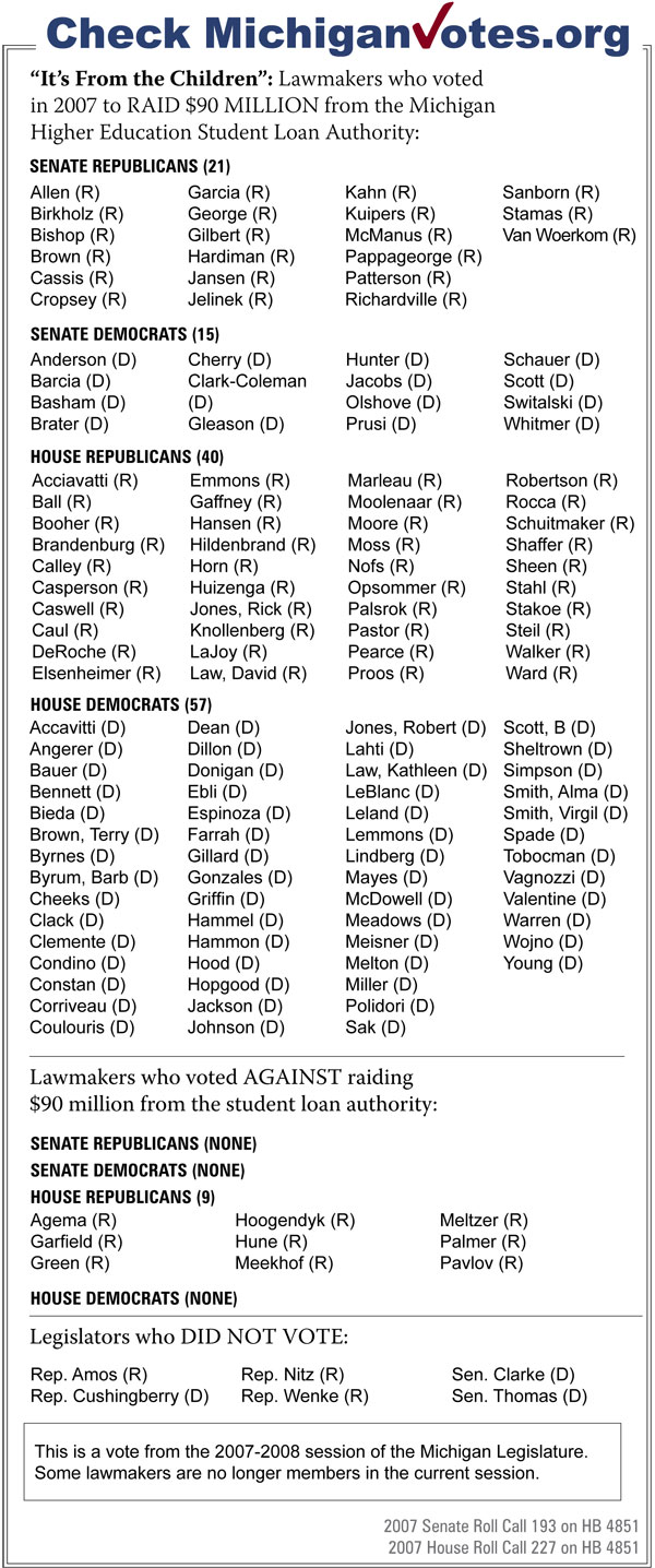 The MichiganVotes.org vote tally for the aforementioned "borrow-and-spend" votes are located to the right. Each of these votes took place during the 2007-2008 session of the Michigan Legislature, and some of the lawmakers listed are no longer in office. Some of those no longer serving have moved on to other elected offices or are announced candidates for the same. Official Web sites and campaign Web sites that could be located for these politicians are provided below.