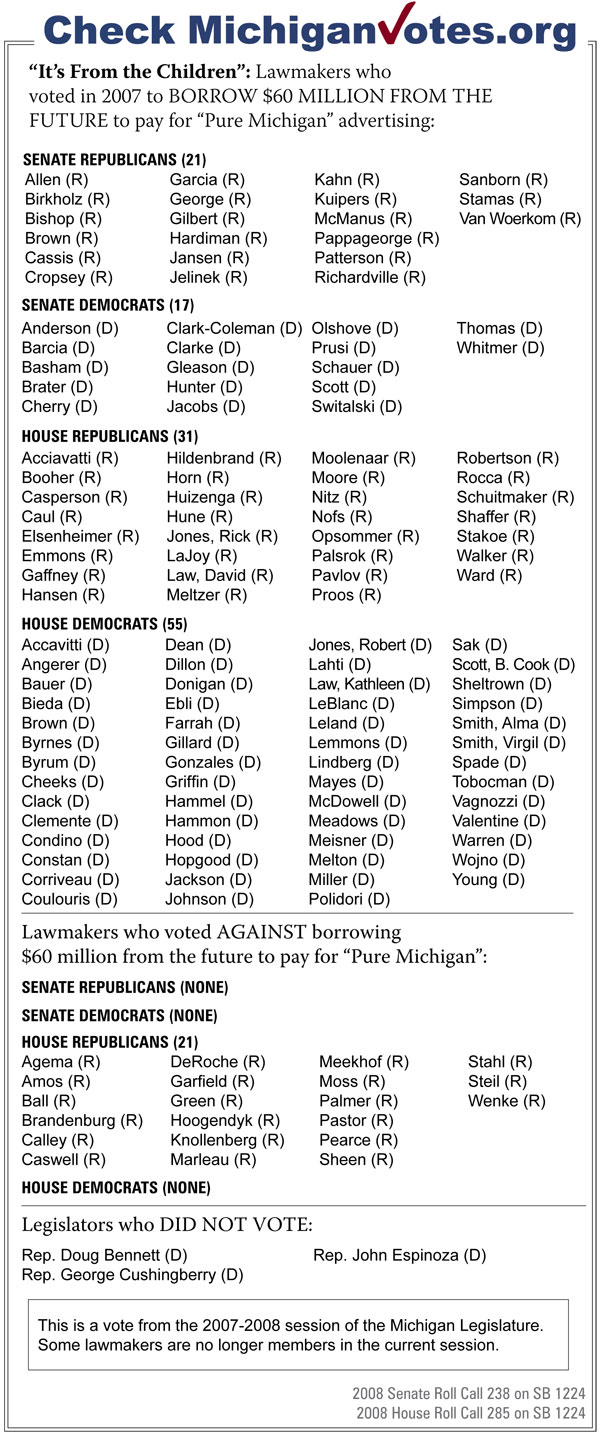 But that's not all. The next trip to this loan window happened just last year, when 37 senators and 86 House members voted to borrow another $60 million for a subsidy to tourism businesses in the form of state advertising, called "Pure Michigan" and related campaigns (www.michiganvotes.org/2008-SB-1224).