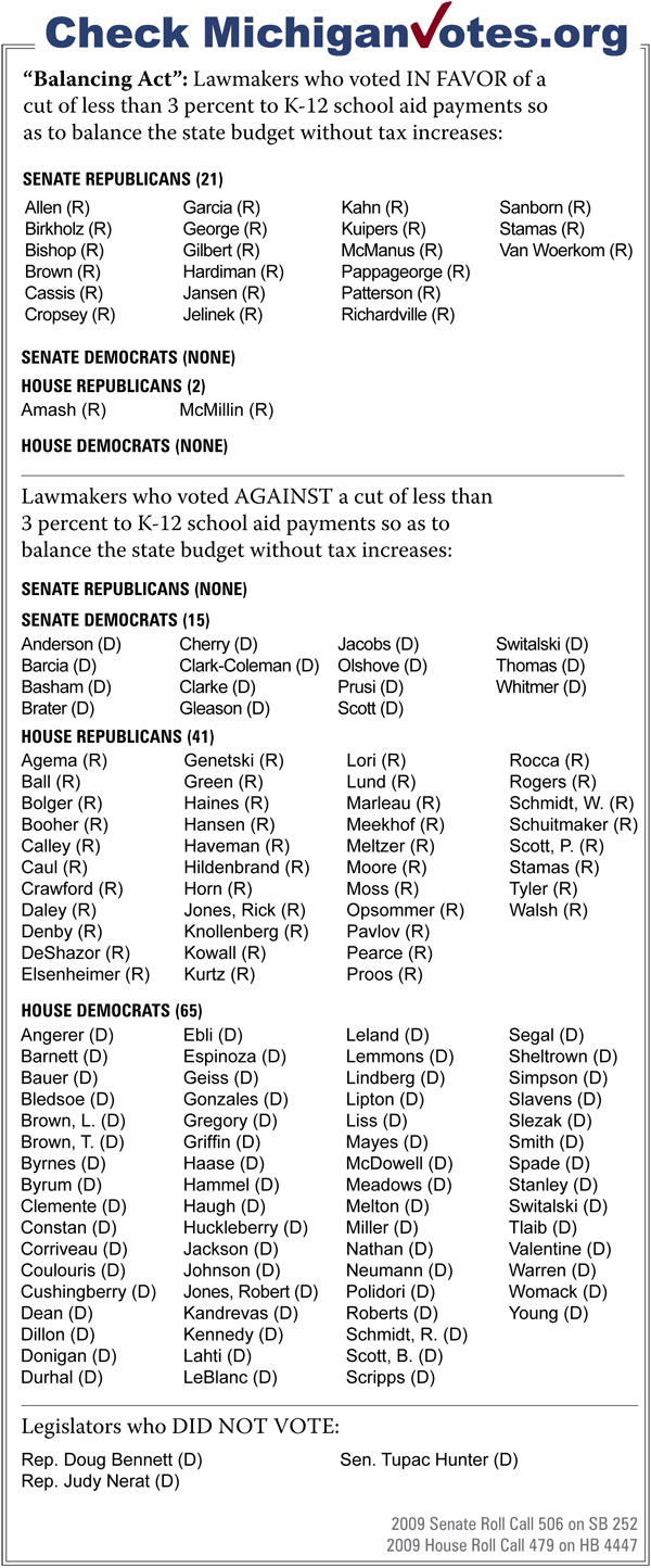 The official vote was a lopsided 106-2. Voting with the majority was one of the authors of the "all cuts" budget, House Speaker Andy Dillon. The two lone House members willing to publicly and officially vote in favor of a 2.9 percent reduction in K-12 spending were Rep. Tom McMillin, R-Rochester Hills, and Rep. Justin Amash, R-Kentwood.