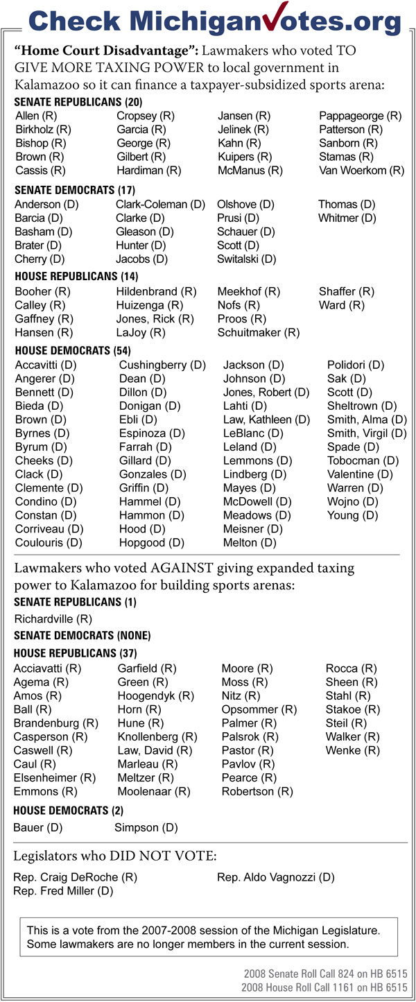 As with the new stadium for the University of Minnesota, a taxpayer subsidy for the new Kalamazoo arena was facilitated by a vote of the Michigan Legislature. According to MichiganVotes.org, 2008 House Bill 6515 expanded "the scope of the law that authorizes local hotel, restaurant and rental car excise taxes to pay for municipal stadiums." Furthermore, it also lowers "a certain population standard, allowing Kalamazoo County and Kalamazoo to levy these taxes."