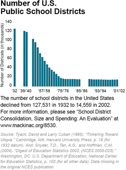 Duncombe's research aligns with a 2007 analysis on school district consolidation done by Andrew Coulson, an adjunct fellow with the Mackinac Center. Coulson's study found that consolidating could hypothetically create savings for small districts, but the statewide impact would be extremely small. In fact, counter-intuitive to this entire discussion, our study showed empirically that the state would save more money by breaking up larger districts than by merging smaller ones.