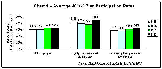 KPMG Peat Marwick, a major accounting firm, surveyed companies and individuals to determine that the rate of employee participation in 401(k) retirement plans is high and increasing (see Chart 1). The 1998 data show that 59 percent of nonhighly compensated employees and 81 percent of highly compensated employees participated (in 1998, the government considered workers making over $80,000 to be "highly compensated"). Employees contribute on average five to seven percent of their paychecks to their retirement plans, a figure roughly equivalent to what Social Security taxes take from their pay.