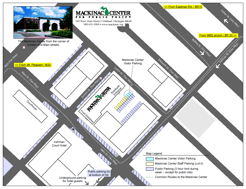 Follow US 131/M 46 North to M 46 East. Then take US 27 North (at St. Louis/Alma) to Mt. Pleasant. Take M 20 East into Midland. After crossing the bridge into downtown, turn right at the light, onto West Main Street. The Mackinac Center will be 2 blocks down on the left, on the corner of Gordon and West Main.