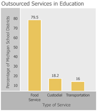 In 2003, the Mackinac Center for Public Policy conducted a survey of Michigan’s 555 school districts in order to assess the extent and effectiveness of contracting with private-sector firms. Of the 517 districts that responded, 176 districts — 34 percent — said they outsource at least one noninstructional service. Of the duties these public school districts outsource (some schools outsource more than one service), the most popular by far is food services with nearly 80 percent employing a private company to manage district cafeteria employees or programs. Another 18 percent contract for custodial duties, and nearly 16 percent do so for their transportation needs.