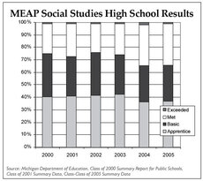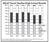 Social studies comprises a significant part of the Michigan Educational Assessment Program test taken by Michigan 11th graders. From 2000 to 2005, an average of only about 28 percent of test-takers met or exceeded state standards in social studies. This means that, on average, nearly three-quarters of students who graduated from Michigan public high schools in the past six years did not meet the state’s standard for knowledge of basic economics, world geography, and the history and institutions of the United States and Michigan. Admittedly, not each of these areas is required by the state for graduation, though they may be by local districts.