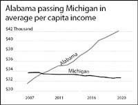 Right-to-work opponents say Michigan would become "an Alabama" if we end compulsory unionism. It’s true that Alabama’s per capita income is lower than Michigan’s, but Alabama is catching up fast. If the trends in both states continue, per capita income in Alabama will exceed Michigan’s in just three years. By 2016, residents in that right-to-work state will be earning $5,288 more than Michiganians on average.
