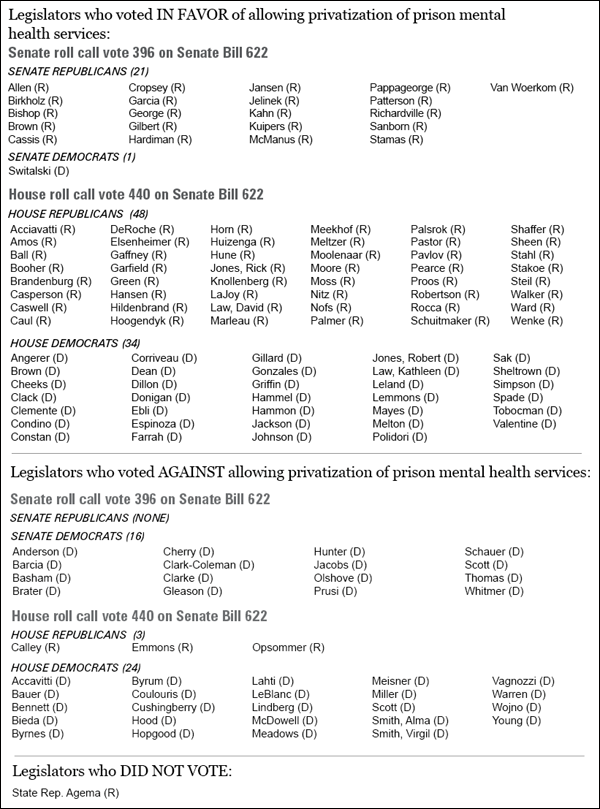 The Michiganvotes.org tallies for the votes on the bill which allows prisons to privatize their mental health care, Senate Bill 622; the main bill regarding teacher retirement benefits, Senate Bill 546; and the main bill requiring MESSA to release its claims history, Senate Bill 418 appear below. (The vote tally for House Bill 4800, which passed overwhelmingly in both houses of the Legislature, has been omitted for space reasons. It may be viewed at www.michiganvotes.org/Legislation.aspx?ID=53535.)