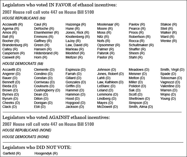 The MichiganVotes.org tally for the bill that authorizes tax breaks for ethanol production appears below.