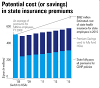 Health care is a complicated issue. James Porterfield (co-author of this commentary) has estimated first-year state savings of $16.2 million based on a number of assumptions. He assumed that all full-time state classified employees are currently covered by an HMO, even though some are covered by the more expensive PPO plan. He also assumed that the state would fully fund the HSAs up to the maximum allowed amount, ($2,900 for an individual and $5,800 for a family in 2008) and increase its contribution to the HSAs at 1 percent per year after that.