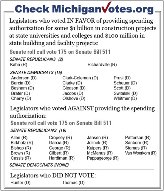 But before that happened, the airport improvement financing became the subject of controversy when Sen. Mickey Switalski, D-Roseville, sponsored an amendment that would have added pre-approval for an additional $1 billion in spending for state university and community college construction projects. This additional spending was supported by the governor, and Switalski argued that it would stimulate Michigan’s fragile economy by creating construction jobs.