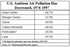 The U.S. Environmental Protection Agency reveals that nationwide levels of all six pollutants thought to adversely affect outdoor air quality have declined significantly since the 1970s. Between 1976 and 1997, ambient levels of ozonethe major contributor to urban smogdecreased 30.9 percent. Sulfur dioxide levelsthe primary component of acid raindecreased 66.7 percent, while nitrogen oxides decreased 37.9 percent, carbon monoxide decreased 66.4 percent, and lead decreased a dramatic 97.3 percent. Particulate matter, commonly known as dust and soot, decreased 25.5 percent since 1988, the first year for which particulate data are available. Most Michigan cities rate below national averages for air pollutants.