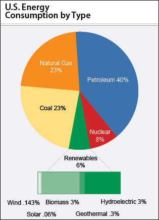 Energy derived from so-called renewable sources now comprises about 6 percent of the more than 100 quadrillion Btu[2] that Americans use annually.[3] As the chart illustrates, the largest shares of renewable energy currently consumed are hydroelectric[4] and biomass.[5]