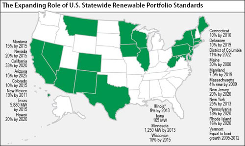 Should present trends continue, the share of energy generated from renewable sources is projected to grow slightly in the next two decades.[6] Congress and state legislatures, however, are considering enactment of "renewable portfolio standards" that would require power companies to generate a quota of electricity from renewable sources.