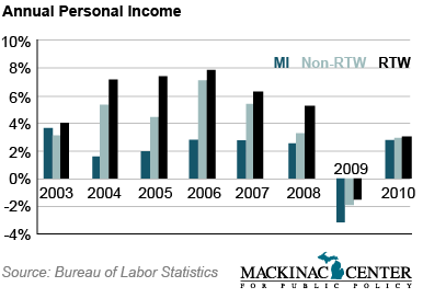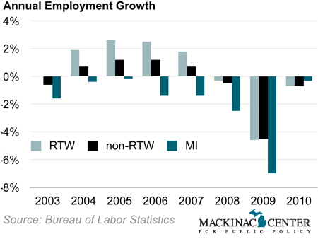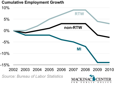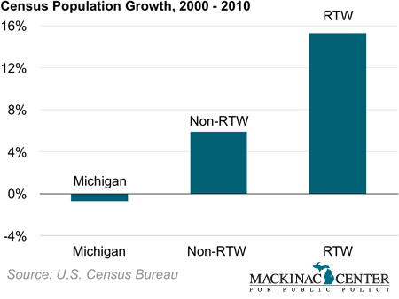 The new 2010 Census figures show that RTW states grew their populations substantially more than non-RTW states. Michigan was the only state of any kind whose population fell.