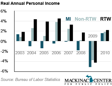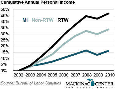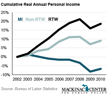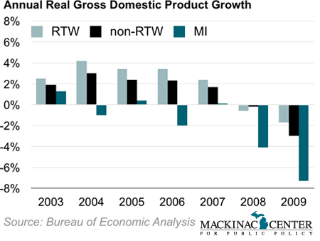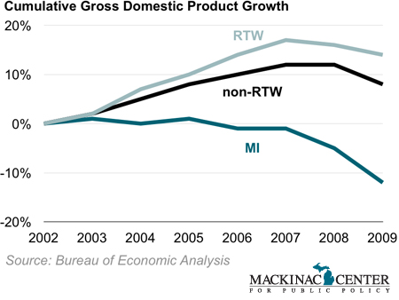 Gross Domestic Product is the value of the goods and services produced in an economy, according to the Bureau of Economic Analysis. These figures are adjusted to inflation. Over time, RTW states outperform non-RTW states while Michigan lost GDP.