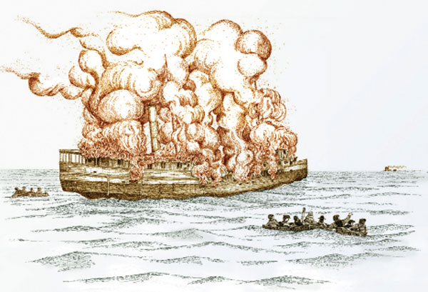 Thus began a relentless six-hour battle with the weather, a fight that ended when a fire started in the engine room. No one knows how the blaze began. Because the water pumps were damaged, the crew was unable to quench the fire, and the flames spread, engulfing first the lifeboats stowed nearby and eventually the entire ship.