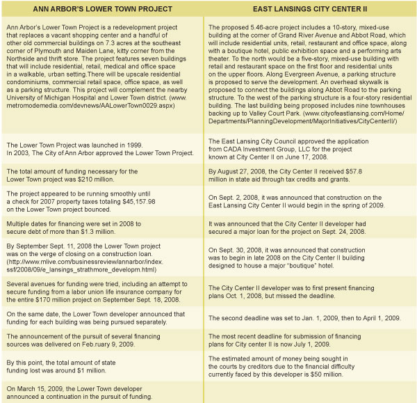 Although these are all admirable goals, there tends to be a disconnect between the desired ends and what actually is achieved by smart growth policy. This essay will provide key information about two specific smart growth projects in Michigan, and help trace each project's development. These two projects include Ann Arbor's Lower Town Project and East Lansing's City Center II.