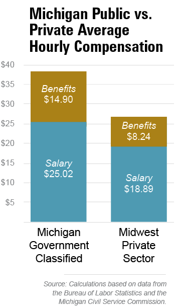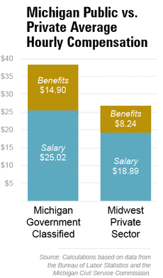 According to calculations based on data from the Bureau of Labor Statistics and figures from the Michigan Civil Service Commission, Michigan’s state and local government full-time employees are getting $5.7 billion more in benefits than they would if their benefits were equal to those of private-sector employees.