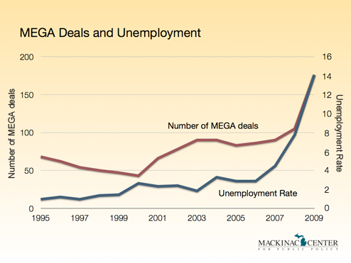 This chart might be called the "Political Class Desperation Index." The need for transformational reform of Michigan's tax, spending, labor and regulatory environments is indicated by the skyrocketing unemployment rate. The failure of the political class to buck special interests — including government employee unions — and finally undertake those reforms makes its members increasingly desperate to create the appearance of "doing something." Thus the massive increase in futile picking of winners (and losers) for receipt of discriminatory tax breaks and subsidies. These create diversionary "feel good" stories for local newpapers, but do nothing to reverse the state's economic decline — and may even accelerate it. ("MEGA" is the flagship program of Michigan's bureaucratic "economic development" empire.)