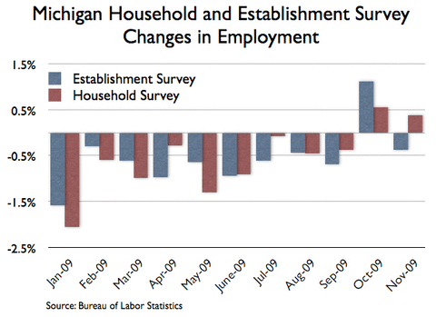 Interestingly enough, the number of payroll jobs in Michigan fell even though the number for household employment (a factor in the unemployment rate calculations) increased. These numbers generally move pretty closely together, but there are a lot more jobs in the household survey than the establishment survey. Conceptually, the establishment survey doesn't cover self-employment, so that could be a reason. The second could be that people are ditching their second job, which would cover a loss in the establishment survey but not the household survey. (More information on the differences between the surveys is here.)