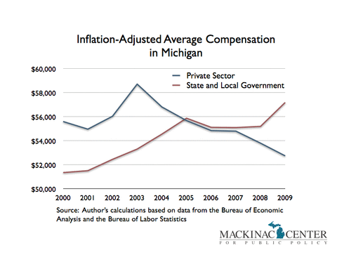 The trend continued in 2009. Average compensation per employee — which includes the value of benefits — was down 2.0 percent for private sector employees but increased 3.6 percent for Michigan's state and local government employees.