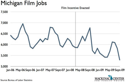 The film subsidy program was signed into law on April 7, 2008. In that month there were 5,867 jobs in Michigan's "motion picture and sound recording industries," the industrial classification that most closely fits the target industry for the program. By last September these jobs had fallen to 5,290, a 9.8 percent decline.