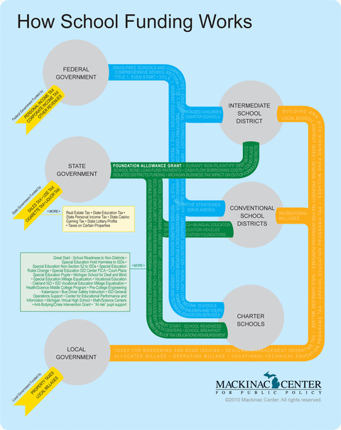 The Michigan Department of Education reports that total public school revenues in 2008 were comprised of 54 percent state sources, 37 percent local sources and 8 percent federal sources.[3]