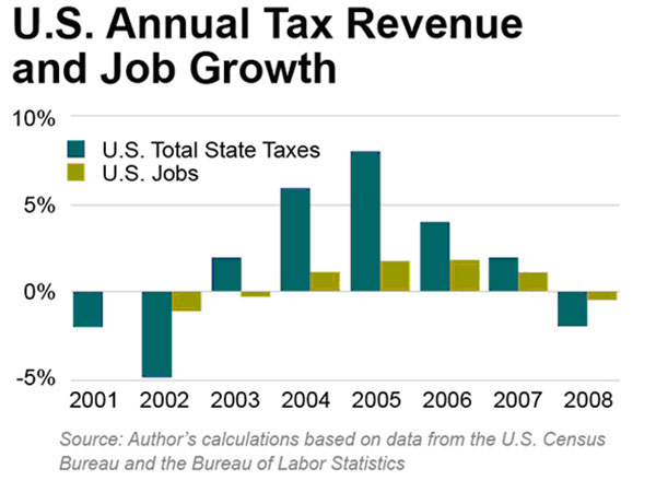 Important for assessing changes in the relative well being of different populations, and not reflected in these state ranking comparisons, is the fact that tax collections are "elastic," which means they respond sharply to economic trends. This chart showing changes in state tax collections compared to growth or decline in employment levels illustrates: