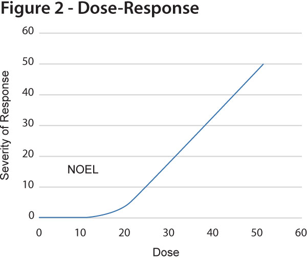This brings us to the concept of dose-response. Many individuals have experienced or are familiar with this phenomenon in a mild way (consider the relationship between the amount of alcohol consumed and the various stages of intoxication). It is a well-documented principle of toxicology that for all chemicals, there is a range of doses over which no apparent toxicity can be identified in exposed individuals (No Effect Level, or NOEL) and there is a higher range of doses over which the toxic properties begin to appear. This is shown in Figure 2.