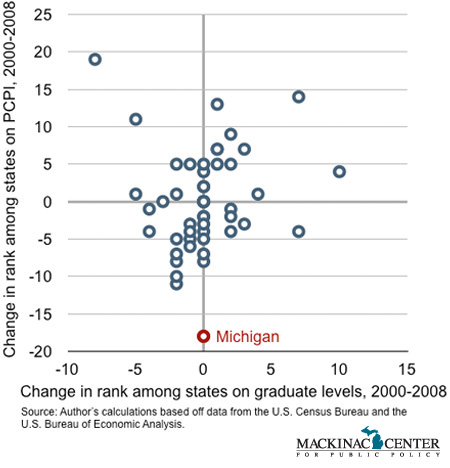 If the hypothesis promoted by Glazer and the lobbyists engaged by Michigan's tax-supported public universities was correct, the various points on this chart would be clustered around an upward sloping line, as states with higher growth in the number of grads also enjoyed relative improvements in income. However, no such trend line exists.