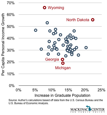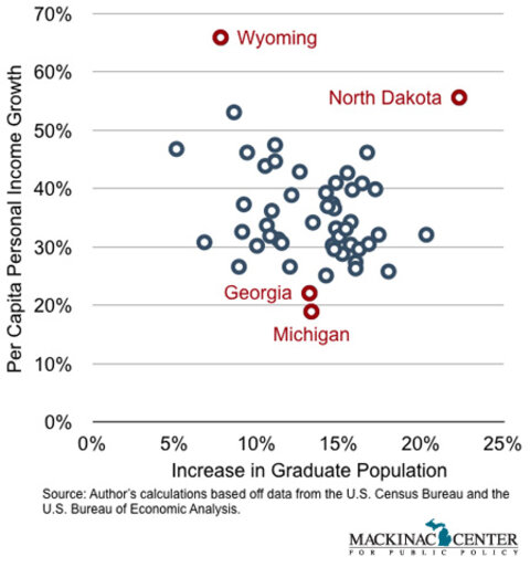 North Dakota led the country in increasing its graduate population, and it also enjoyed the second best performance among the states in per capita personal income growth. In contrast, the similar economy of Wyoming had the best performance by this measure, but was near the bottom (48th) in growing its graduate base. Large amounts of oil and natural gas exploration were responsible for much of that economic growth in this western state. But even when North Dakota beats every other state in following Glazer's prescription, its economic consequences are indistinguishable from Wyoming, a state that effectively took the opposite prescription.