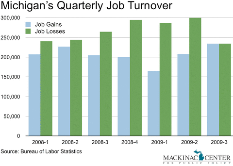 In addition, a little heralded release of the job turnover shows that Michigan's net job creation and destruction leveled off in the third quarter of 2009 following four quarters of large increases in job losses.