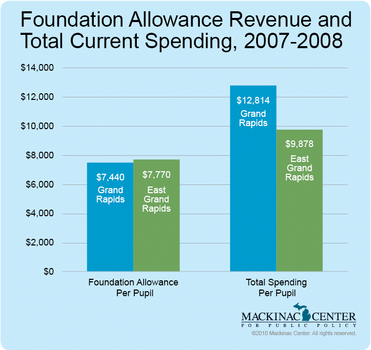 The foundation allowance is only one school revenue source, however, and money from other sources further reduces disparities. For example, the foundation allowance for Grand Rapids schools is around $300 less per student than the neighboring district of East Grand Rapids, but the Grand Rapids district receives much larger amounts of federal and state "categorical funding" that is allocated in large part on the basis of having a greater number of students from low-income households. In 2007-2008 (the latest data available), Grand Rapids schools spent $3,000 more per pupil on operations than its wealthier neighbor — a disparity would-be "levelers" unlikely want to reverse.