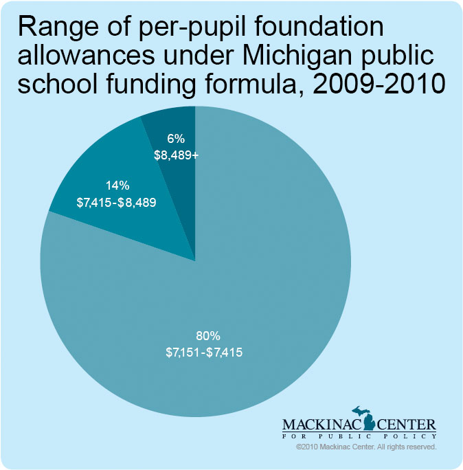 But, the vast majority of schools now are funded at levels that fall in a fairly narrow range. The House Fiscal Agency reports that in the 2009-2010 school year, 80 percent of all districts (including charter public schools) receive between $7,100 and $7,400 per student through the foundation allowance formula; 94 percent fall between $7,100 and $8,500.