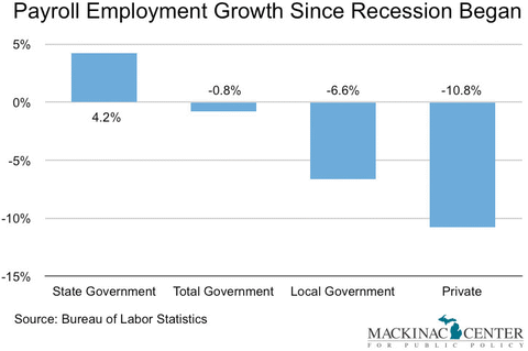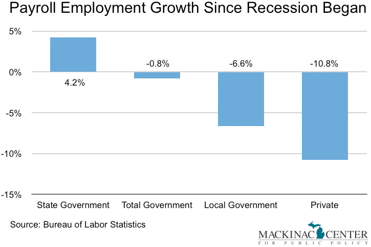 Of course the private sector provides many more jobs than the public sector, but even on a percentage basis the magnitude of the discrepancy is startling: Private-sector employment in Michigan fell by 11 percent, while there are just 1 percent fewer government workers than before the recession.