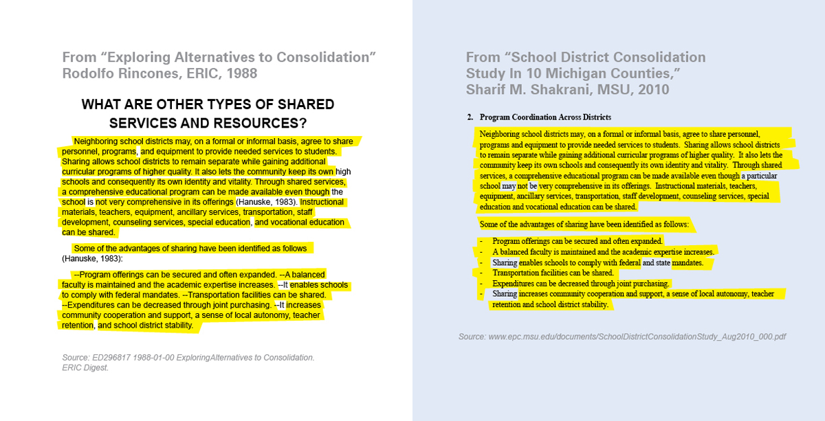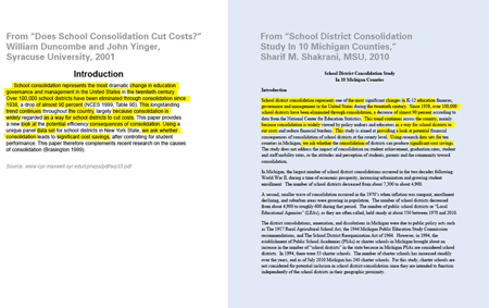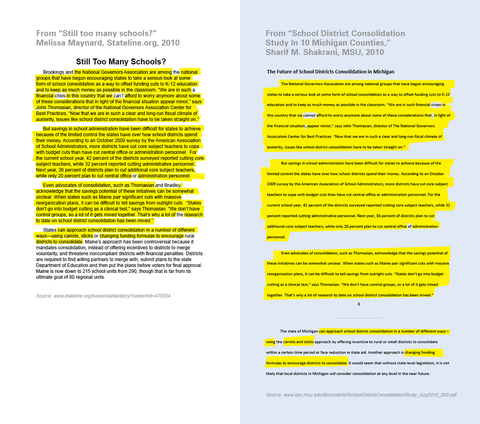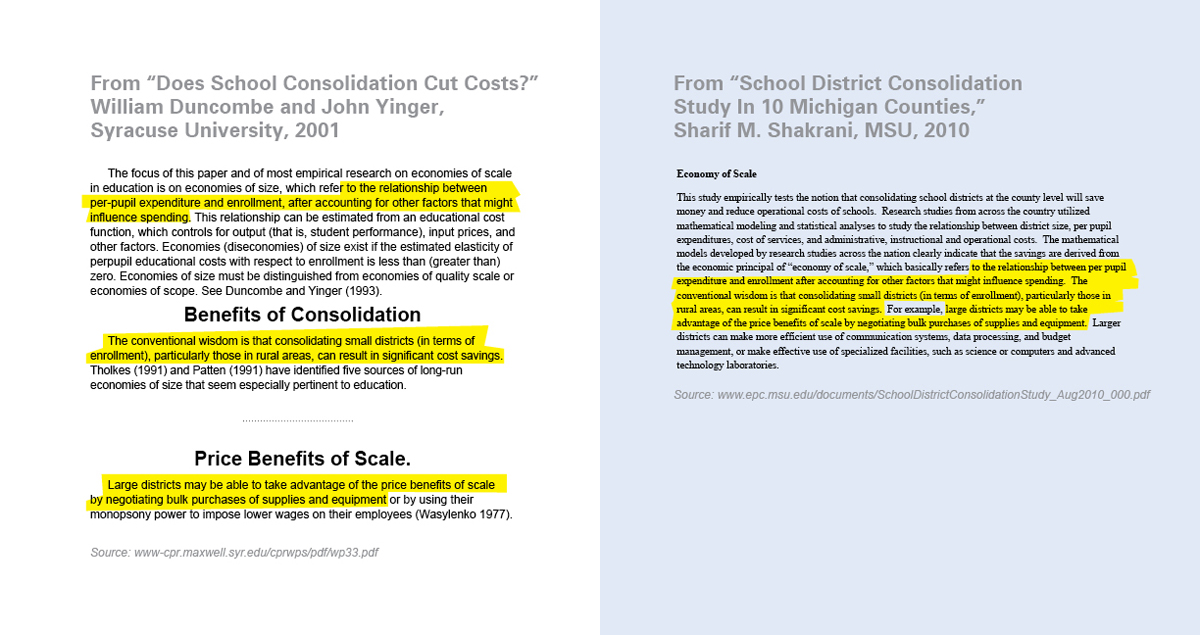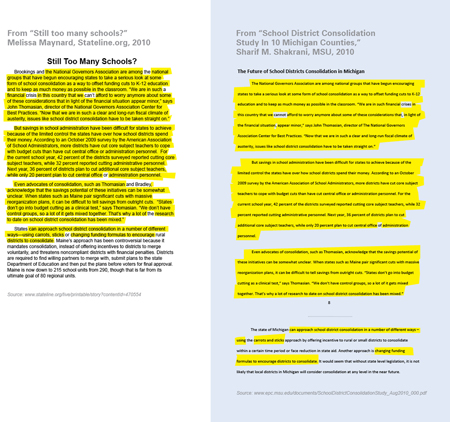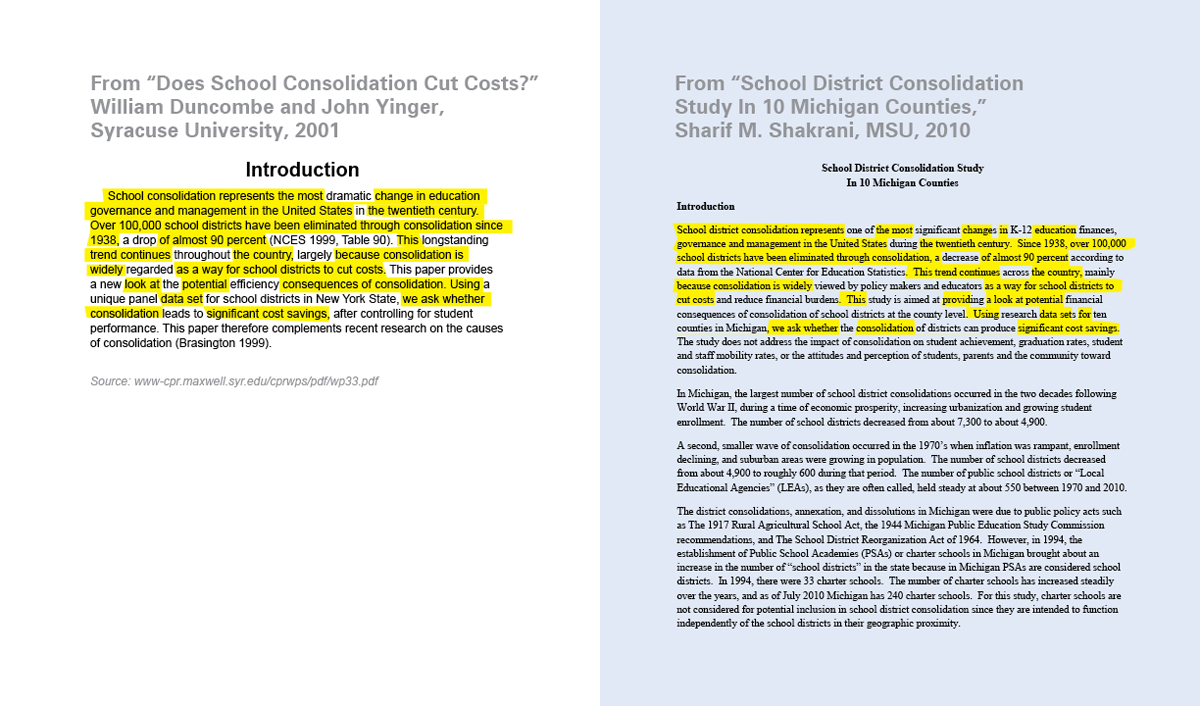 A recent study published by Michigan State University's Education Policy Center appears to contain a significant amount of plagiarized material. Some are saying the only problem with the study is lack of proper attribution. In the original work, only one of sources below was even mentioned. Here are a few examples; see for yourself and decide.