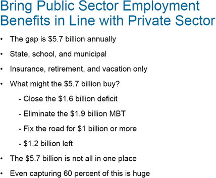 That’s one reason to pursue this $5.7 billion in savings. Employee benefits are simply where the money is in state and local government. At least in the sense that there may be no more achievable, necessary and fair way to trim $5.7 billion in one fell swoop.