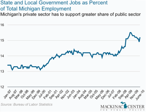 This chart shows that government jobs in Michigan make up a larger percentage of the economy than they did a decade ago.