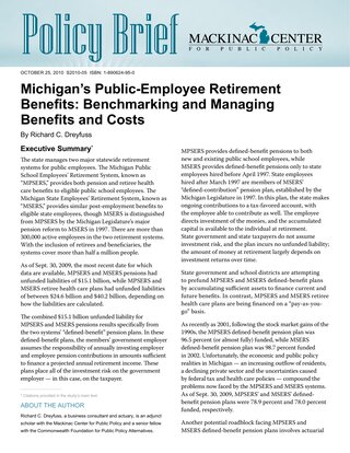 This paper reviews MPSERS and MSERS pension and retiree medical benefits and confirms many of the published concerns* related to the level of benefits provided and the associated fiscal challenges facing Michigan taxpayers in both the short and long term.