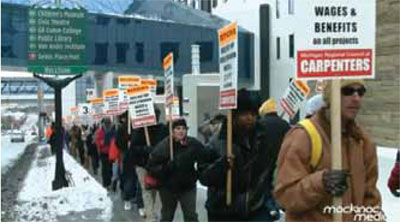 Hoekstra’s video featured an interview with a West Michigan contractor who found himself a victim of this tactic. Hoekstra and her video camera also tracked down a union protest in progress outside a Grand Rapids hospital. Her questions to a union official at the scene of that protest revealed even more about how far the carpenters union will go to disrupt honest business practices.