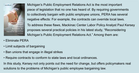 April 20 found Paul Kersey, director of labor policy, speaking to the Michigan House Education Committee on legislation involving penalties for illegal teacher strikes. Current penalties make the teacher strike ban difficult to enforce. Earlier in the year, Kersey suggested that teachers unions that conduct illegal strikes should lose their collective bargaining power for at least three years. By April, amidst rumors of strikes, the House took up two bills to put teeth into the ban. Testifying on these bills, Kersey said: “Collective bargaining (for government employees) is a privilege, not a right. An illegal strike is the ultimate abuse of that privilege.”